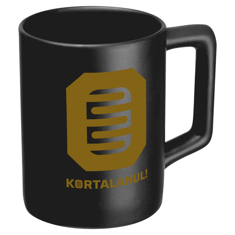 Kerámia Bögre egyedi formájú, szögletes fogantyúval – Kortalanul! felirattal és logoval – fekete és fehér színben